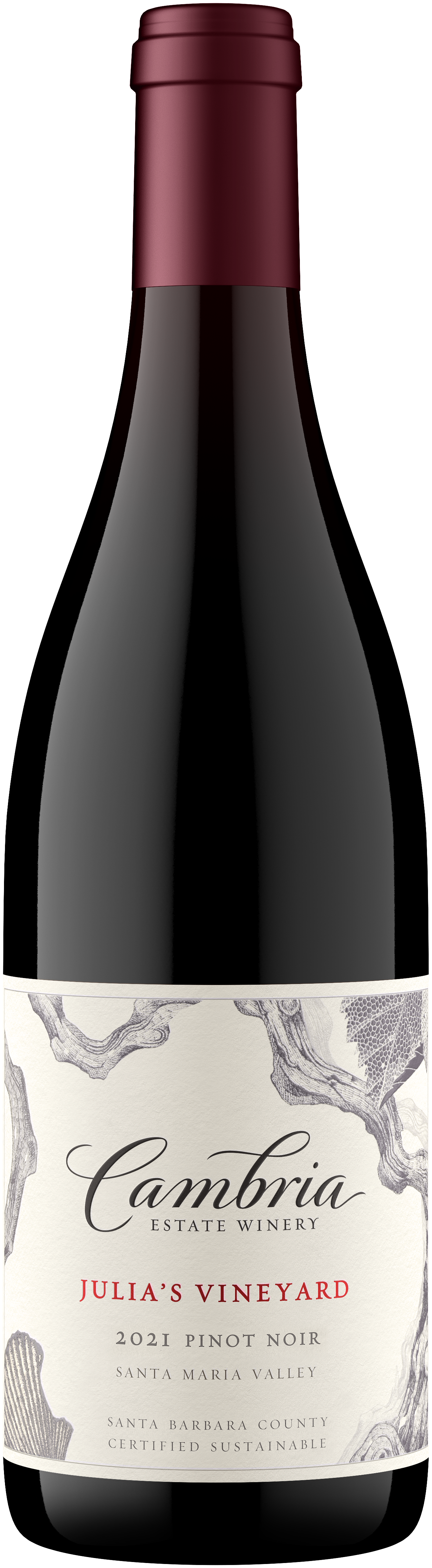 The Cambria Estate Winery 2021 Julia's Vineyard Pinot Noir is fragrant, red-fruited, and complex example of why the Santa Maria Valley excels with Pinot. Balanced with a touch of savory earth tones and oak spice, pair. 93pts Wine Enthusiast.