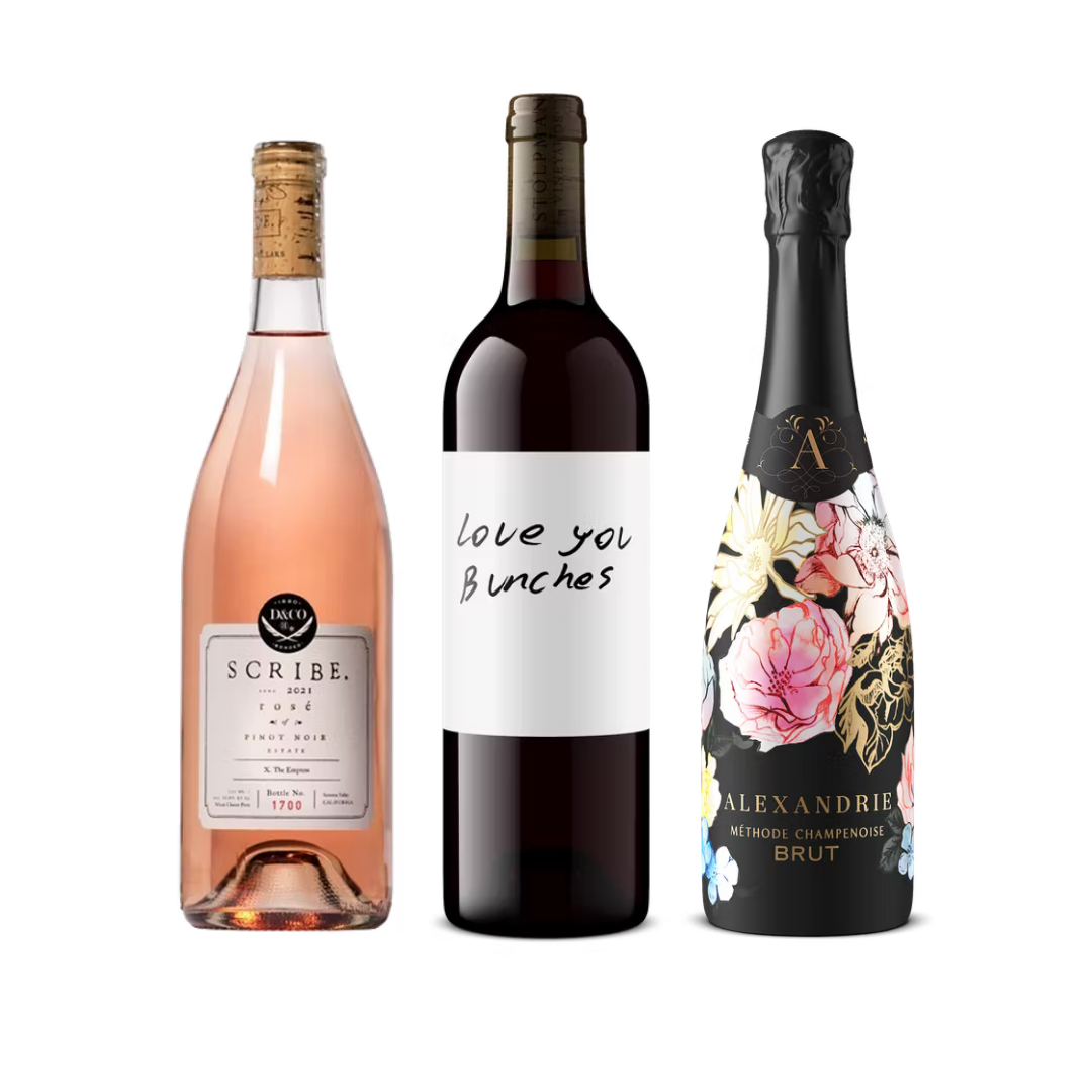 This bundle includes one bottle each of the 2021 Scribe Estate Rosé, the NV Alexandrie Brut, and the 2021 Stolpman Vineyards 'Love You Bunches' Sangiovese. These wines will make mom's day just a little more special whether she's looking to have fun at brunch or spruce up dinner at home with the family.
