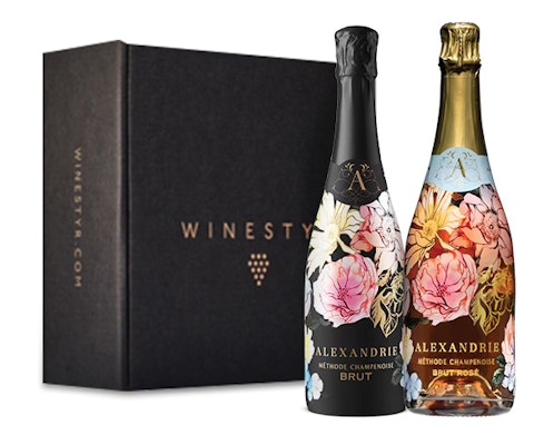 This two bottle gift set is shipped in a signature black Winestyr gift box and contains two exquisite bottles of bubbly, the NV Alexandrie Brut and the NV Alexandrie Brut Rosé. The NV Brut is a Champagne-style sparkler that was crafted in the traditional Methode Champenoise and the Brut Rosé is the perfect compliment, providing more power and decadence on the palate. This package makes for the perfect thank you or celebratory gift as an alternative to Veuve Clicquot, Moët & Chandon, or Billecart Salmon.