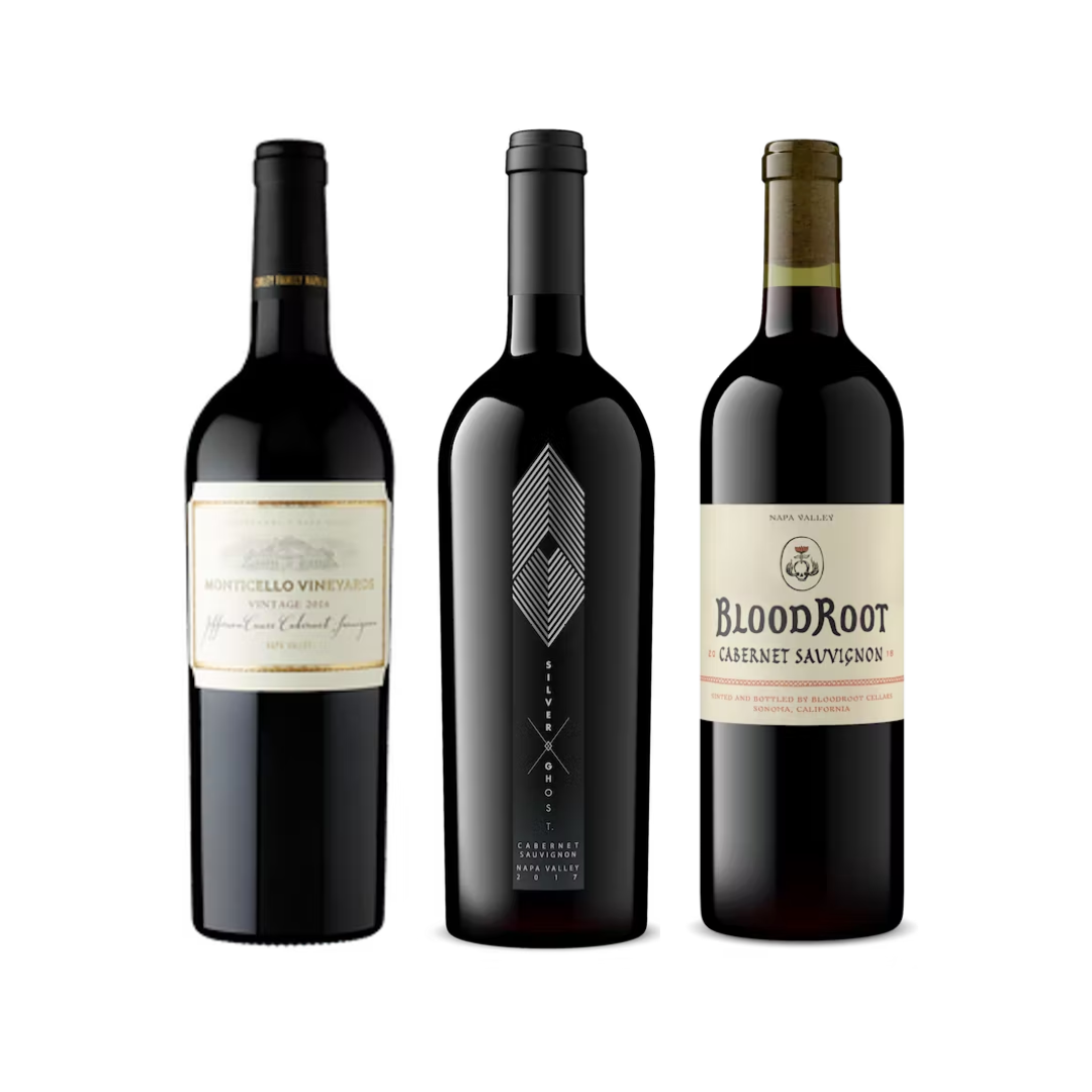 This trio contains three of our favorite Napa Valley Cabs: one bottle of the 2019 Monticello Estate Cabernet Sauvignon, one bottle of the 2019 Napa Valley Cabernet Sauvignon by Silver Ghost and one bottle of the 2019 BloodRoot Napa Valley Cabernet Sauvignon. The perfect gift for any Napa Cab lover.