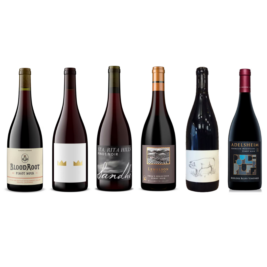 This collectiom includes 6 bottles of impressive Pinot Noir, 3 from California and 3 from Oregon. Enjoy everyday sippers like the 2019 Wonderland Project Two Kings Pinot Noir, the 2019 BloodRoot Pinot Noir and the 2018 Lemelson Thea's Selection Pinot Noir and then dive into high-end, luxurious Pinots like the 2020 Sandhi Sta Rita Hills Pinot Noir, the 2018 Big Table Farm Willamette Valley Pinot Noir and the 2017 Adelsheim Vineyard Boulder Bluff Pinot Noir. This amazing array of wines is perfect for any Pinot Noir lover or any holiday celebration.