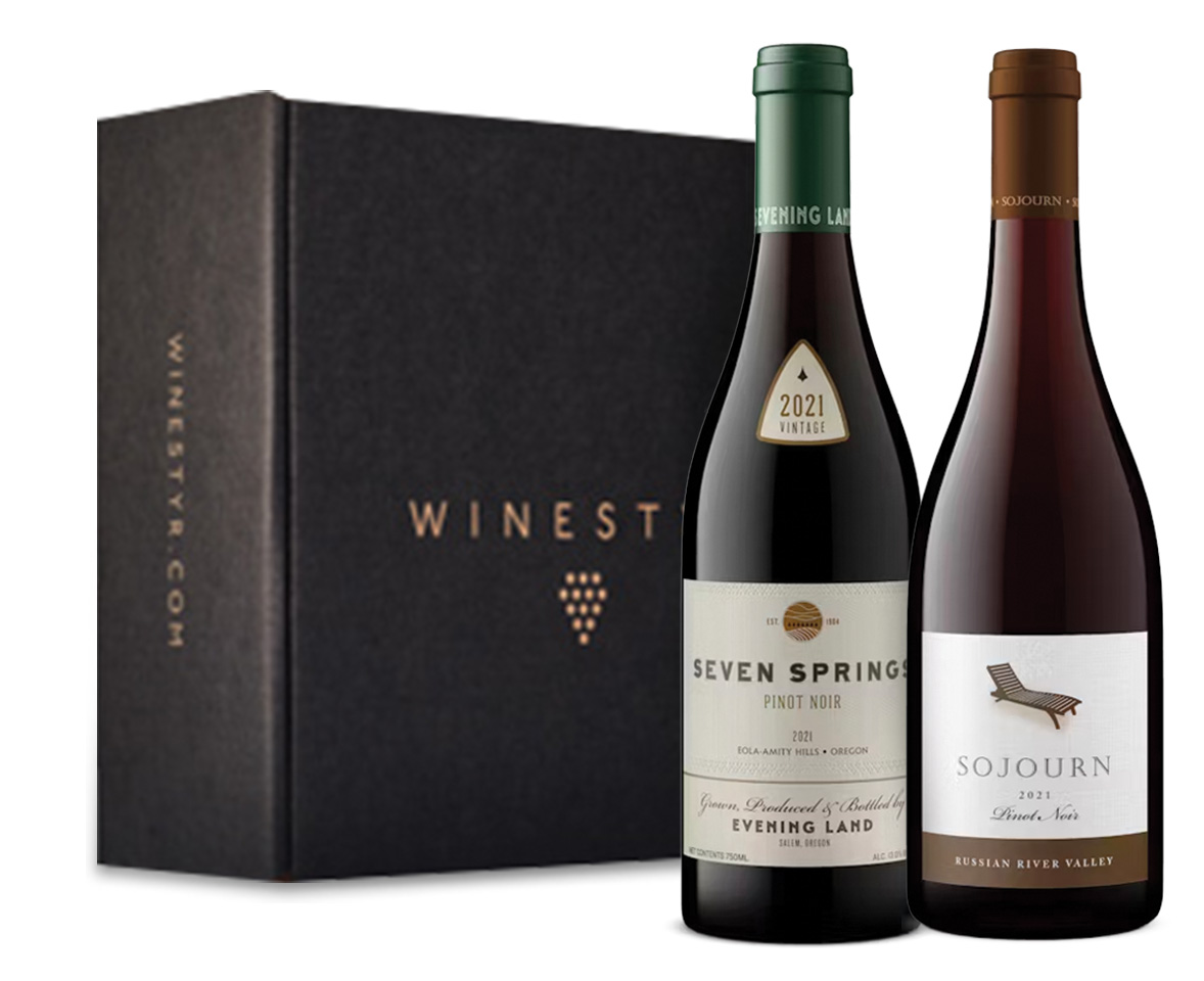 This two bottle gift set is shipped in a signature black Winestyr gift box and includes two impeccably made Pinot Noirs, one from Sonoma California and the other from the Willamette Valley in Oregon. The Sojourn Cellars 2021 Russian River Valley Pinot Noir flashes a burst of ripe raspberry and cola spice, the wine persists through the palate with a silky mouthfeel and just a dusting of tannin. The 2021 Evening Land Seven Springs Pinot Noir shows off a lush texture and high toned aromatic intensity. 94 pts Wine Spectator. This package is the perfect gift for any Pinot Noir lover.